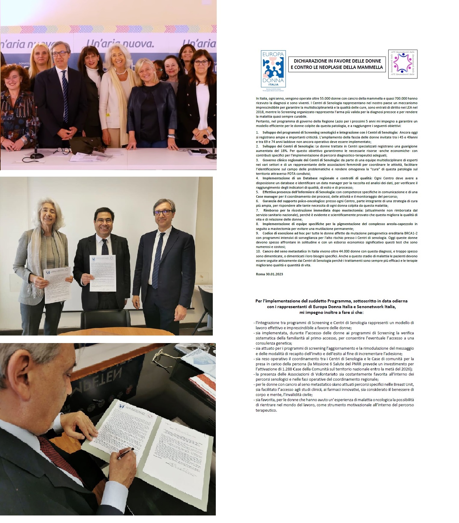 Ringraziamo Donatella Bianchi, Alessio D’Amato e Francesco Rocca per aver sottoscritto la dichiarazione in favore delle donne, che prevede un impegno in dieci punti che spaziano dallo sviluppo dei programmi di screening senologici, all'integrazione con i Centri di Senologia, al governo clinico e alla richiesta di maggiore attenzione per le donne con tumore al seno metastatico, insieme ad altre richieste delle pazienti e l’importante presenza delle associazioni all’interno delle Breast Unit della Regione Lazio.